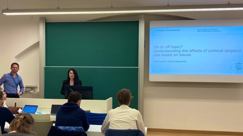 In the panel on Digital Media and AI as political tools, PhD candidate Xiaotong Chu and Rens Vliegenthart presented a paper in which they focus on understanding the effects of political targeted ads based on issues. PI Sanne Kruikemeier gave insights into a literature review of data-driven campaigning presenting a model to understand its effects.